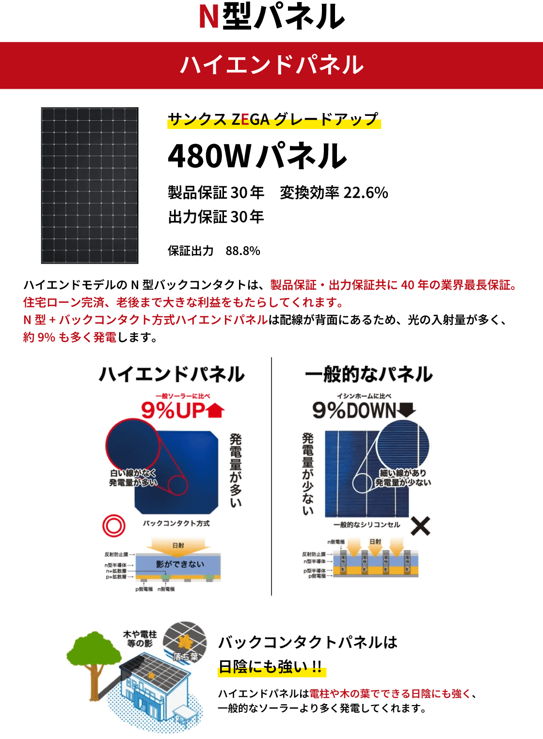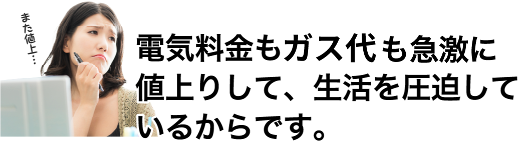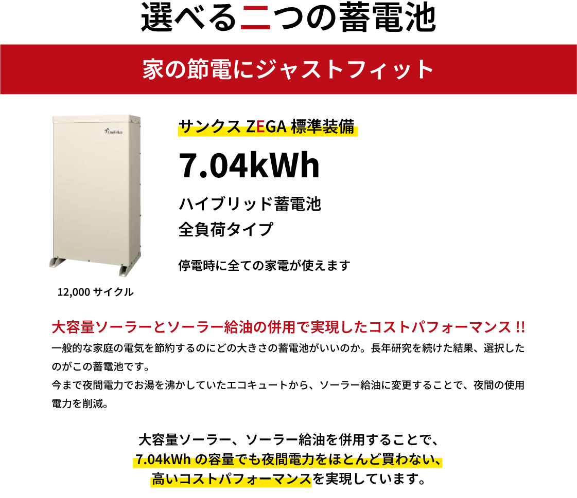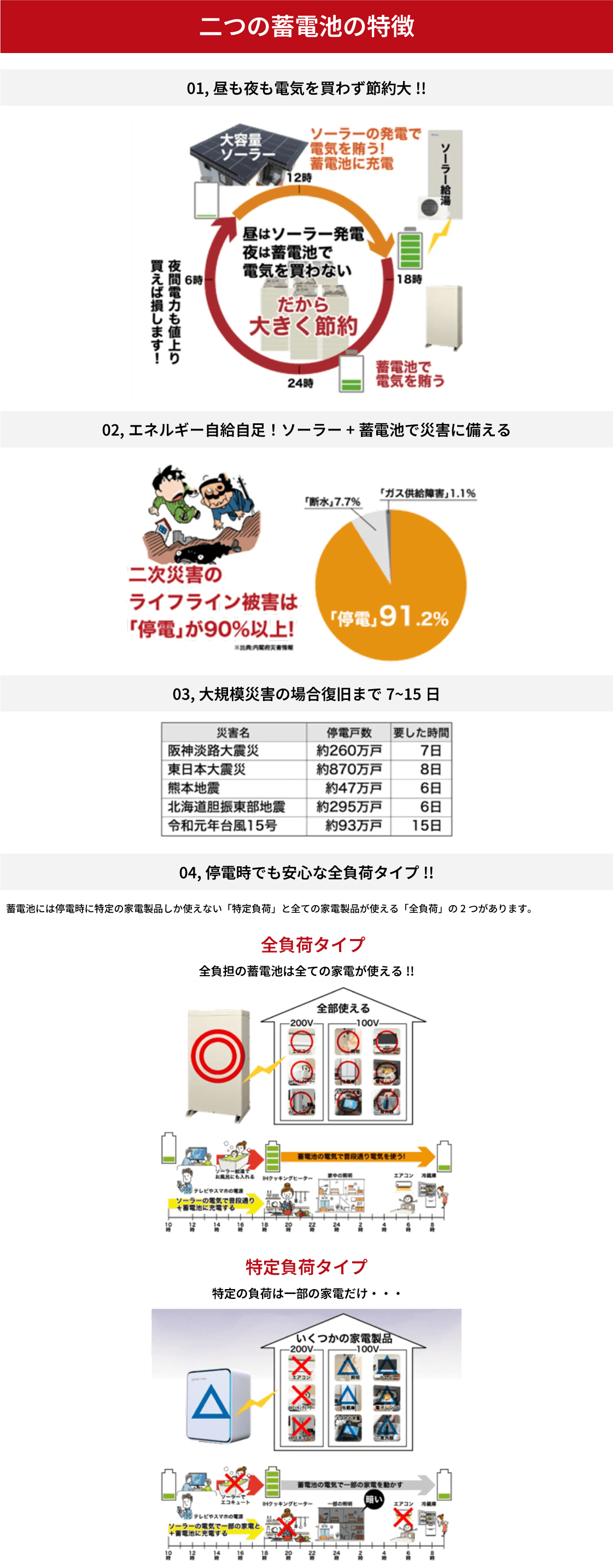 ※1.金額は設置条件、地域、家族構成、ライフスタイルなどに異なります。参考資料としてお考え下さい。オール電化、4人家族の平均光熱費1.7万円/月の50年間の光熱費累計です。中国電力のオール電化プランを基に作成しています。基本料金1650円、昼間の電気29.32円/kWh、深夜電力18.23円/kWh。値上りの計算は基本料金を除き従量部分を当初10年間は値上り無し、11-20年は120%、21-35年は150%、36-50年は200%として計算。太陽光の1kWあたり年間発電量は1252kWh/1kW。自家消費量は年間消費電力4600kWhまでは、1200kWhとして、超える部分を比率に応じて加算。ソーラーの劣化率は1-20年は100%、21-40年は95%、41-50年は93%としています。蓄電池は質容量は名目容量の80%、劣化率は当初10年間100%、11-20年70%、21年目に全固形電池買い替えて50年まで使用することとする。気象庁データから地域別に雨、雪の日を算出。蓄電池の蓄電量、購入電力に加味。※2.ガソリン単価は160円/㍑とし、値上りは揮発油税50円/㍑を除く部分を電気料金に準じて計算。ガソリン車の燃費は15km/㍑、EV車の電費は158W/1km。現在の月々のガソリン代が2万円と1.2万円の場合で予測値を算出。EV車への乗換えは10年後として計算。