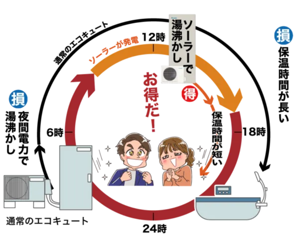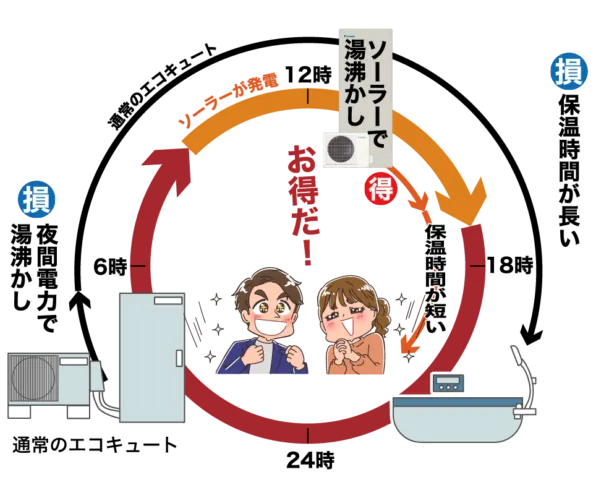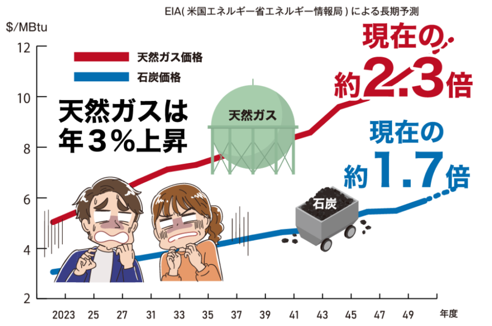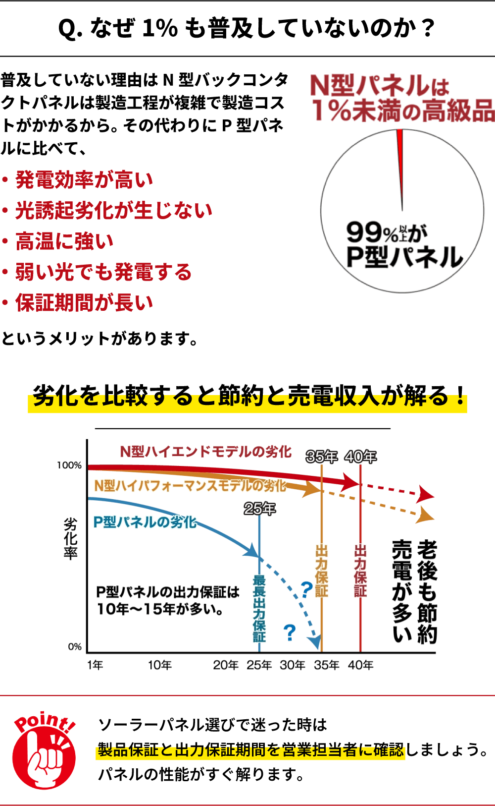 ※1.金額は設置条件、地域、家族構成、ライフスタイルなどに異なります。参考資料としてお考え下さい。オール電化、4人家族の平均光熱費1.7万円/月の50年間の光熱費累計です。中国電力のオール電化プランを基に作成しています。基本料金1650円、昼間の電気29.32円/kWh、深夜電力18.23円/kWh。値上りの計算は基本料金を除き従量部分を当初10年間は値上り無し、11-20年は120%、21-35年は150%、36-50年は200%として計算。太陽光の1kWあたり年間発電量は1252kWh/1kW。自家消費量は年間消費電力4600kWhまでは、1200kWhとして、超える部分を比率に応じて加算。ソーラーの劣化率は1-20年は100%、21-40年は95%、41-50年は93%としています。蓄電池は質容量は名目容量の80%、劣化率は当初10年間100%、11-20年70%、21年目に全固形電池買い替えて50年まで使用することとする。気象庁データから地域別に雨、雪の日を算出。蓄電池の蓄電量、購入電力に加味。※2.ガソリン単価は160円/㍑とし、値上りは揮発油税50円/㍑を除く部分を電気料金に準じて計算。ガソリン車の燃費は15km/㍑、EV車の電費は158W/1km。現在の月々のガソリン代が2万円と1.2万円の場合で予測値を算出。EV車への乗換えは10年後として計算。