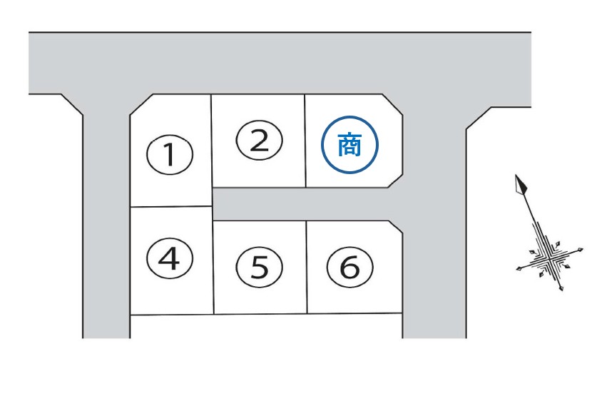 | 土地面積 | ①号地 148.40㎡(44.89坪) ②号地 149.69㎡(45.28坪) ③号地 150.21㎡(45.44坪) ④号地 150.40㎡(45.50坪) ⑤号地 149.69㎡(45.28坪) ⑥号地 150.22㎡(45.44坪) 道路減歩 93.15㎡(28.18坪) |